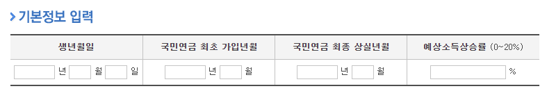 공인인증서가 없어도 예상 수령액을 알아볼 수 있습니다. 공인인증서가 있다면 좀 더 정확한 수령액 확인이 가능합니다. 예상 연금조회를 클릭한 후 매월 납부하고 있는 국민연금을 입력하고 가입한 기간을 입력한 후 조회하기를 선택합니다.