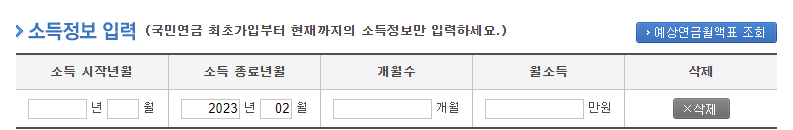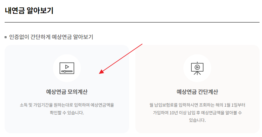 '예상연금 모의계산'을 통해서도 수령액 알아보기가 가능합니다. 소득 및 가입기간을 원하는대로 입력하면 예상 수령액을 확인할 수 있습니다.