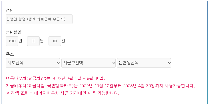 잔액조회는 에너지바우처 사용 기간에만 이용 가능합니다. 겨울 바우처는 사용기간은 2022년 10월 12일부터 2023년 4월 30일까지 사용가능합니다.