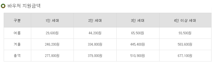 에너지바우처 지원금액은 가구인원에 따라서 차이가 있습니다 1인세대의 총 지원금액은 277,800원, 2인세대의 경우 379,000원이 지원됩니다.