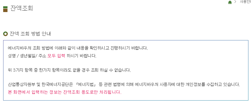 홈페이지에서 에너지바우처 잔액조회 메뉴에서 성명, 생년월일, 주소를 입력하면 바로 확인이 가능합니다. 다만 3가지 모두 일치해야 하며 틀리면 잔액조회가 불가하니 유의해야 합니다.