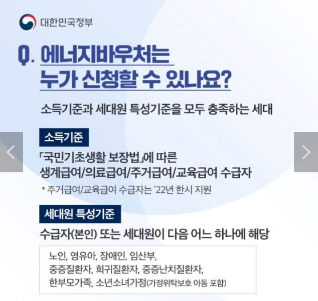 에너지바우처 신청 소득기준은 국민기초생활보장법에 따른 생계급여, 의료급여, 주거급여, 교육급여 수급자입니다. 참고로 주거/ 교육급여 수급자는 2022년 한시적 지원대상입니다.