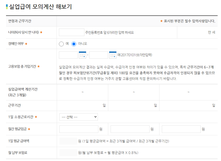 내가 받을수 있는 실업급여 금액을 정확하게 알고 싶다면 정부 고용노동부 홈페이지 실업급여 모의계산기를 이용해서 계산해 보시기 바랍니다.