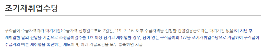 즉, 실업급여를 신청했는데 취업이 바로 됐다면 받을 수 있는 금액의 1/2를 받게 되는 것입니다. 조기 재취업 수당 조건에 대해서 자세히 알고 싶다면 고용보 홈페이지를 참고하시기 바랍니다.