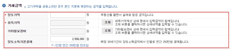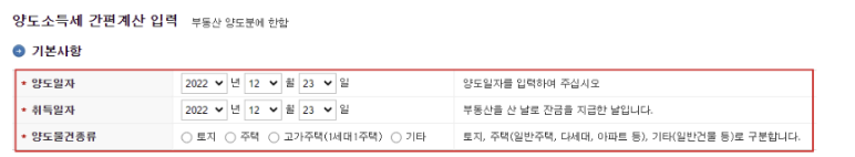 양도소득세 자동계산 페이지에 들어가면 양도일자, 취득일자, 양도물건 종류 등을 입력해야 합니다. 만약 취득가액 조회가 가능한 경우에는 매입가격, 취득세, 등록세, 법무사 비용, 취득중계 수수료 등을 입력할 수 있습니다.