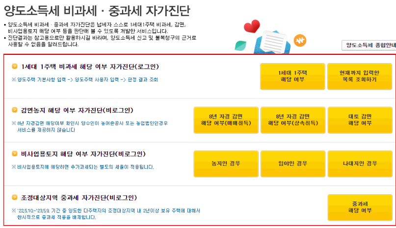양도소득세 비과세 대상인지 중과세 대상인지 잘 모르겠다면 양도소득세 자가진단을 통해 확인하는 것이 좋습니다.