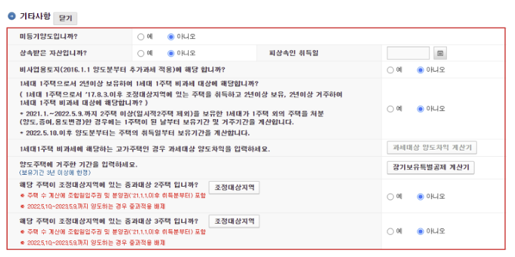 필요한 정부를 입력하고 마지막을 세율 절감 효과가 있는 장기보유특별공제와 조정대상지역 여부를 입력해 줍니다. 비과세 요건 체크 항목에서는 1세대 1 주택으로 2년 이상 보유했는지, 다주택자인지 등을 체크할 수 있습니다.