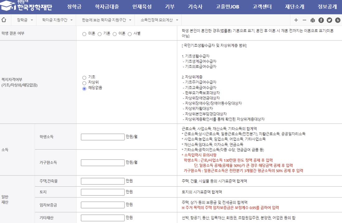 소득분위 모의계산을 통해 소득과 재산 상황을 기반으로 국가장학금을 신청할 수 있는 자격이 있는지를 확인할 수 있는데요.