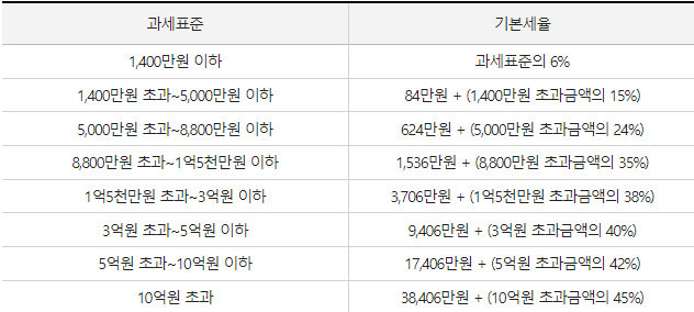 - 5억 원 초과 ~ 10억 원 이하: 42% (공제액 3,594만 원)