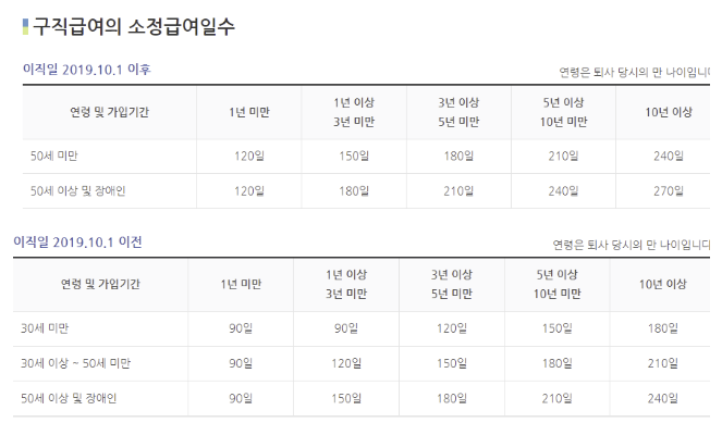 예를 들어, 50세 미만이면서 근속기간이 3년 이상인 경우에는 수급기간이 180일이 되고, 5년 이상 근속한 경우에는 210일, 10년 이상 근속한 경우에는 240일이 됩니다.