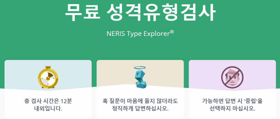 10분 내외의 자가 문단을 통해 성격을 테스트할 수 있기 때문에 그동안 알지 못했던 자신의 성향을 테스트 보시기 바랍니다. 기존에 MBTI 검사를 했던 분들이라도 유형이 변경되는 경우가 많기 때문에 공식 홈페이지를 통해서 검사해 보세요.